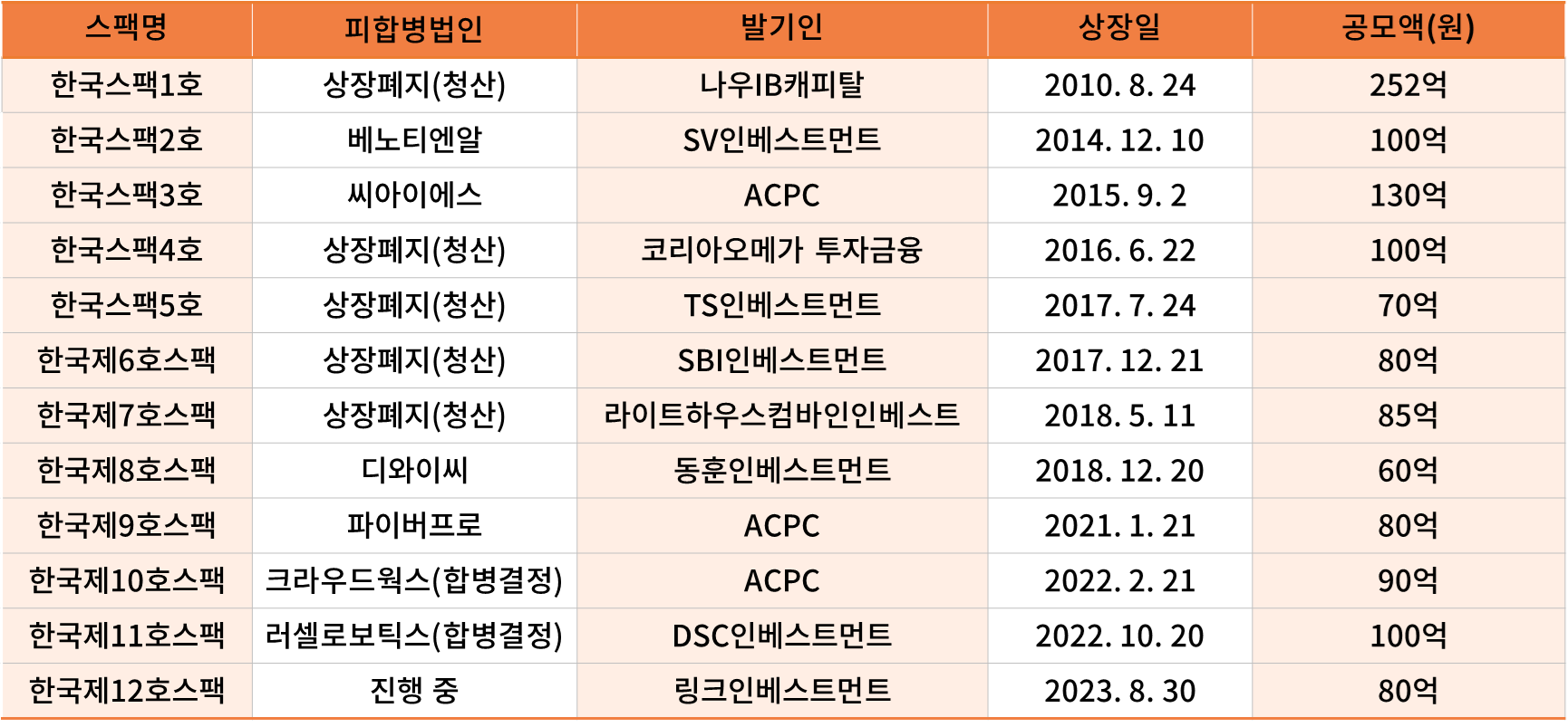 역대 한국투자증권 스팩 합병 현황을 아래 표와 같이 정리해 봤습니다.