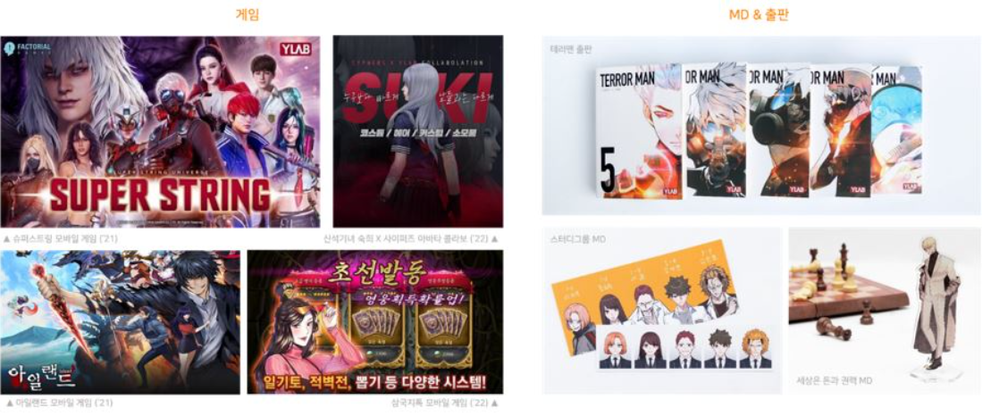 제작 웹툰 저작물을 제3자에게 이용허락하거나 또는 자체적으로 사업 전개를 하여 OSMU 사업화하고 있습니다.