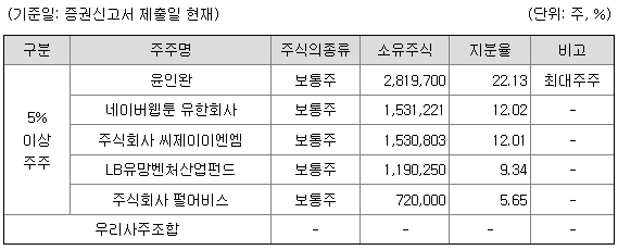 5%이상 주주 현황(공모 전 지분율) CJ E&M, 펄어비스 등의 상장 회사가 지분을 가지고 있습니다.