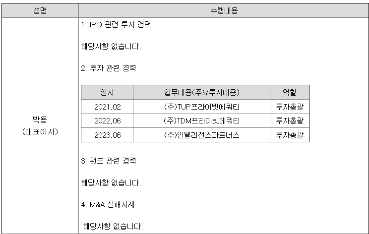 임원들의 경력사항 임원의 M&A 및 IPO 등 관련 주요 경력사항은 아래 표와 같습니다.