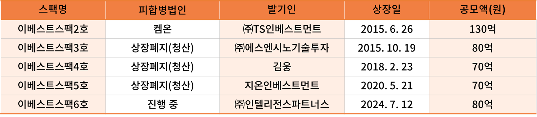 이베스트스팩 역대 스팩 현황 이베스트스팩2호는 켐온과 흡수합병하였습니다.