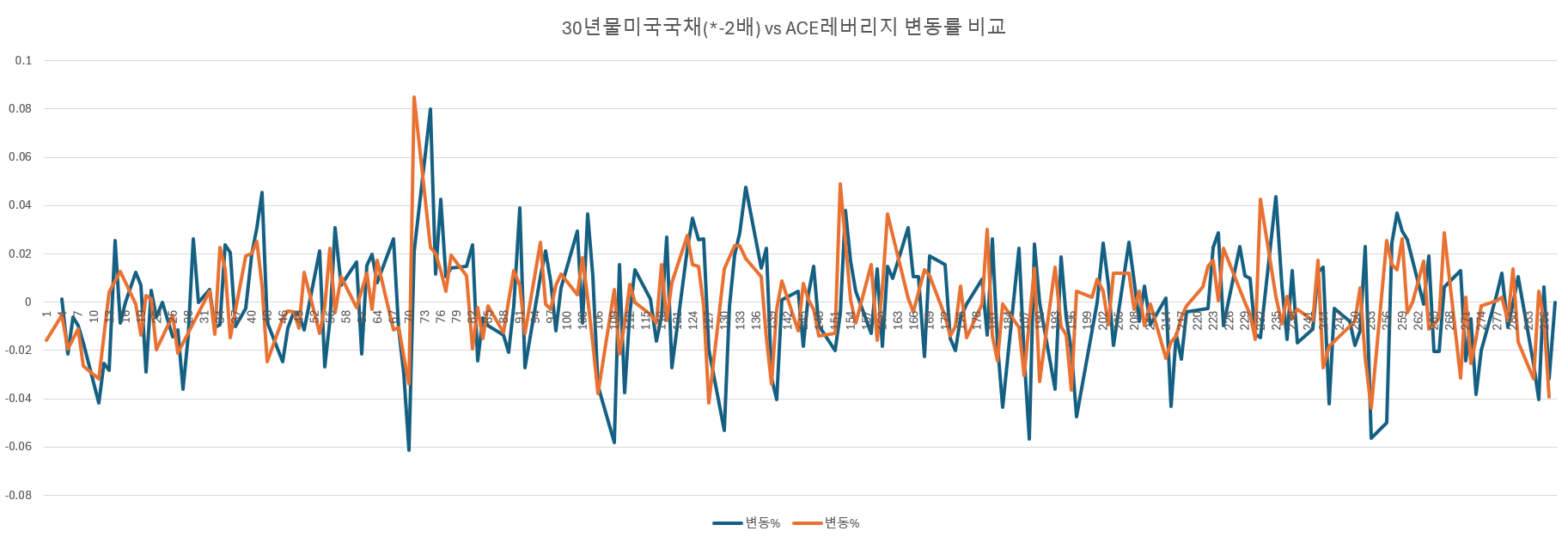 그래프에서 보듯이 30년물 미국 국채 변동률과 ACE 미국30년국채선물레버리지(합성 H) ETF의 변동률은 비슷한 흐름을 보여주고 있습니다. 두 자산의 변동폭이 유사하게 움직이는 점을 통해, 해당 ETF가 미국 30년물 국채의 가격 변동을 잘 추종하고 있음을 확인할 수 있습니다. 이는 투자자에게 레버리지를 통해 국채 변동에 대한 수익을 극대화할 수 있는 안정적인 추종 성과를 제공함을 시사합니다.