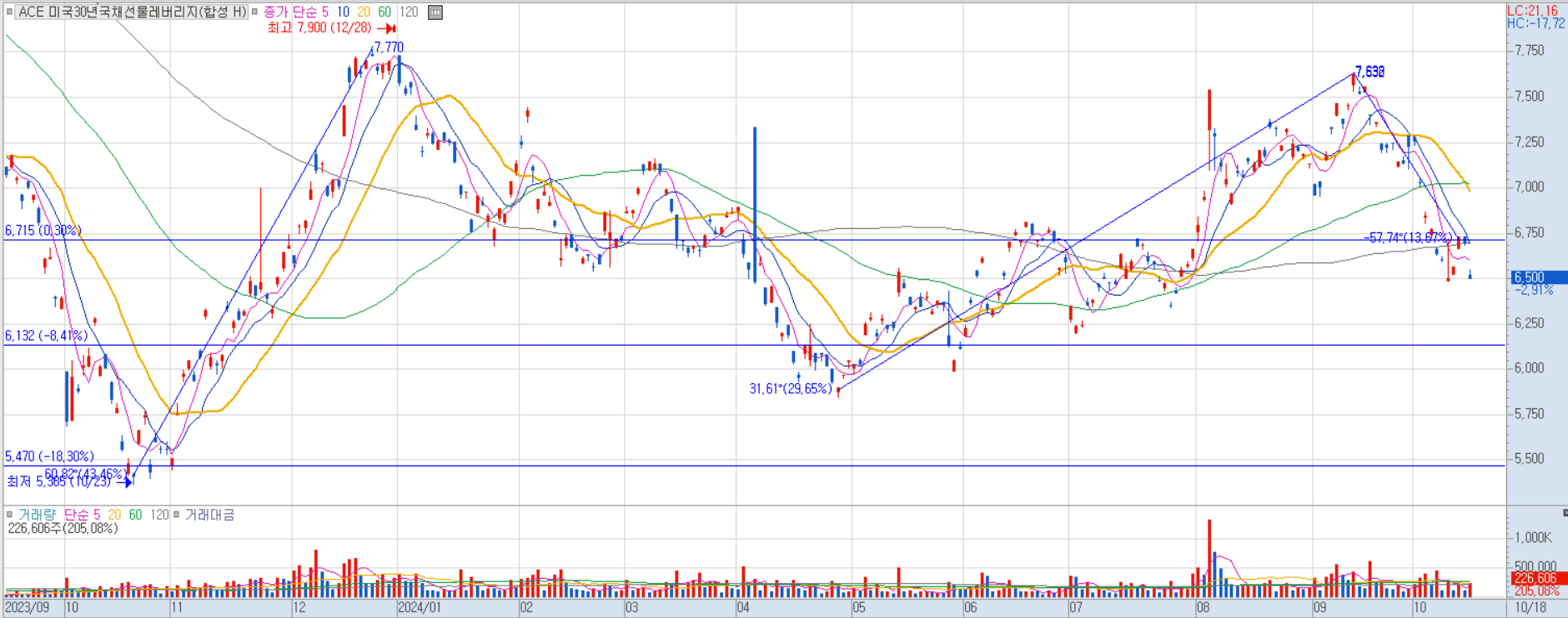 ACE 미국30년국채선물레버리지(합성 H) 주가 최근 미국 30년물 국채 금리가 이스라엘-하마스 갈등 등의 영향으로 약 4.3%까지 상승했지만, 상황이 안정된다면 3.9% 수준으로 충분히 내려올 가능성이 있다고 보고 있습니다. 금리 인하 기대가 호재로 작용할 수 있고, 반대로 횡보할 경우 ETF 특성상 수익률이 하락할 위험이 있습니다. 과거 최고치인 5.01%를 넘어설 가능성은 낮다고 판단하며, 추가 악화 없이 상황이 유지될 것이라는 기대가 바탕입니다.