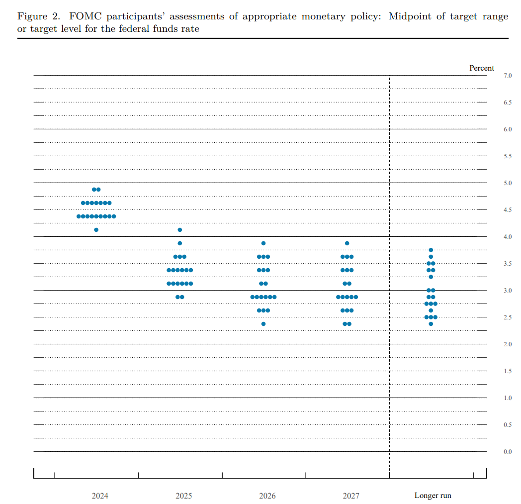 이 점도표에 따르면 연준 위원들 사이에 2025년에는 금리 인하가 필요할 것으로 보는 의견이 다수 존재한다는 점을 알 수 있습니다. 이를 근거로 미국 채권 시장에 대한 투자 전략을 세울 때, 금리 하락에 따른 채권 가격 상승과 수익률 변화 등을 고려할 수 있습니다.