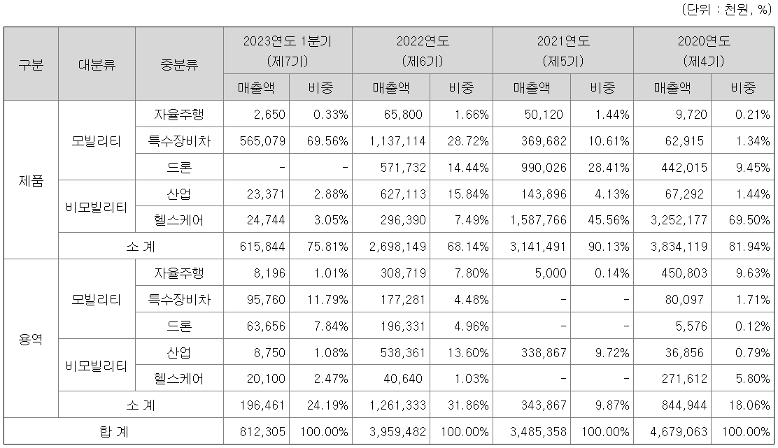 매출은 특수장비차, 드론, 산업 등 제품 판매에서 주요 매출이 일어나고 있습니다.